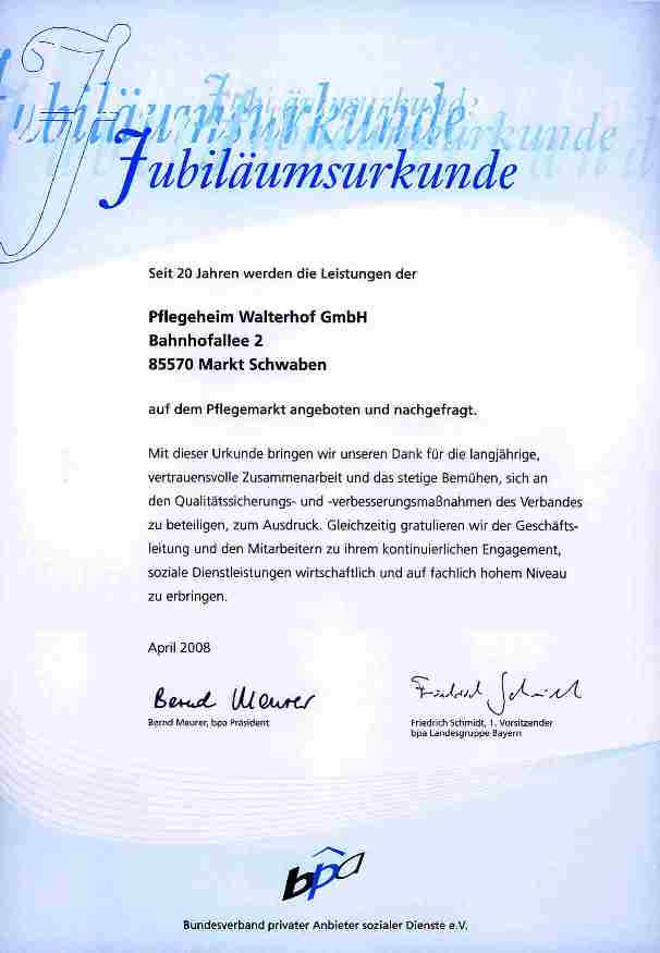 für 20 Jahre Mitgliedschaft an die Pflegeheim Walterhof GmbH, vertreten durch