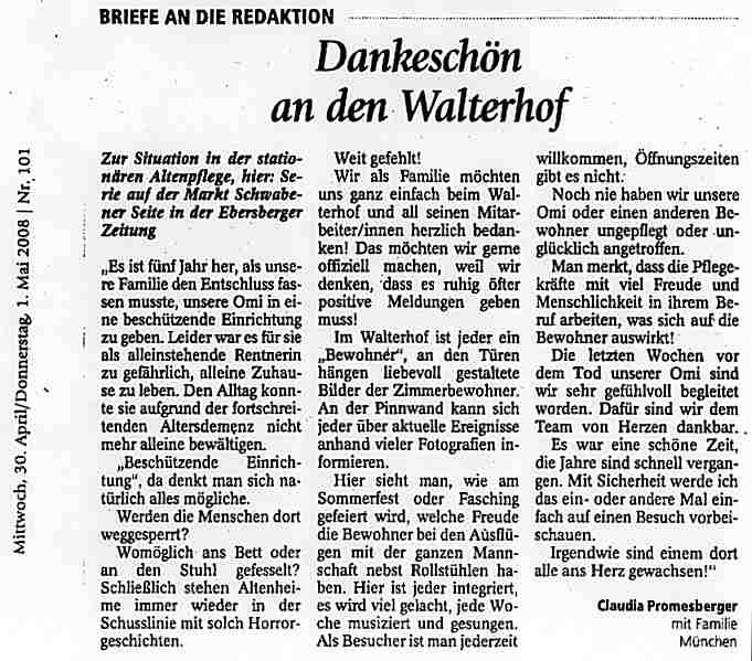 30.04.2008 - Leserbrief über Pflegeheim Walterhof in der Ebersberger Zeitung